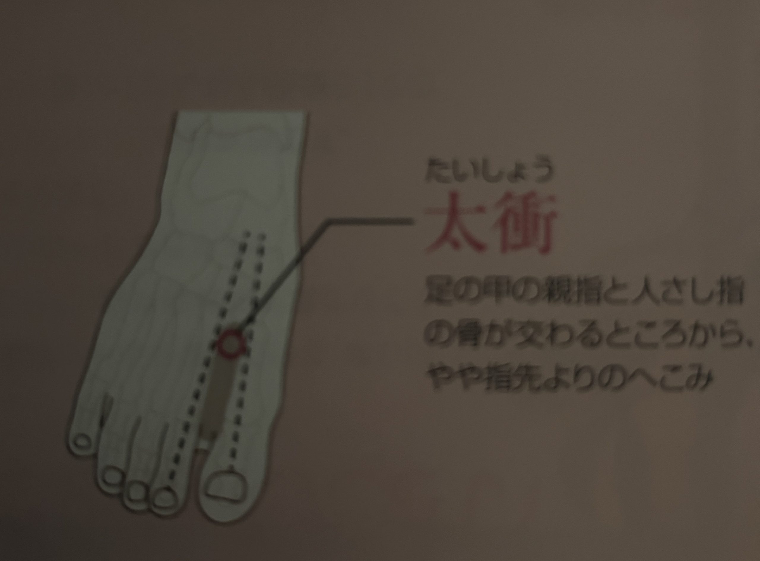 太衝(たいしょう)足の甲、親指と人差し指の骨が交わるところから、やや指先よりのへこみ。